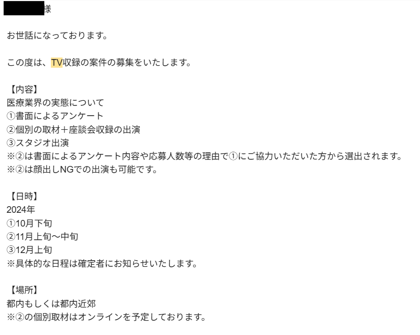 今回は、私が実際に参加した テレビ収録バイトの体験談 を紹介します。 看護師としての経験を活かしながら、ちょっと特別な副業に挑戦したい方の参考になれば嬉しいです。